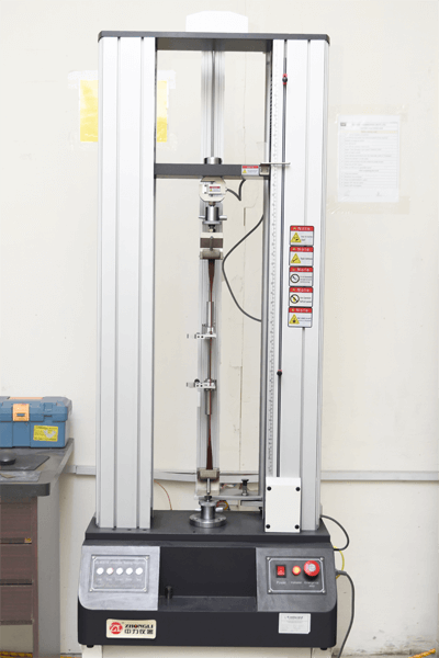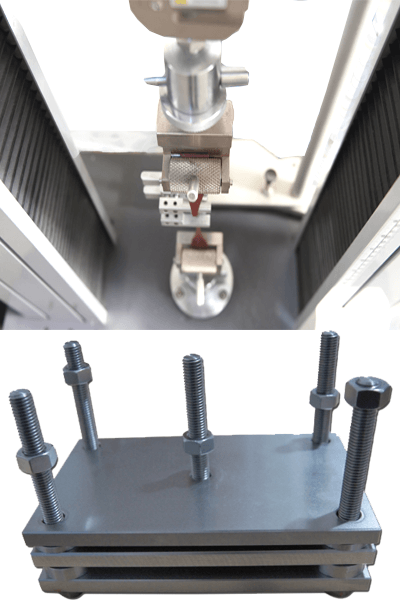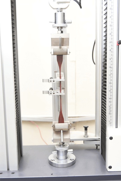 The Tensile Strength of cured rubber specimens is evaluated using the ASTM D412-16 test method on a Universal Tensile Tester