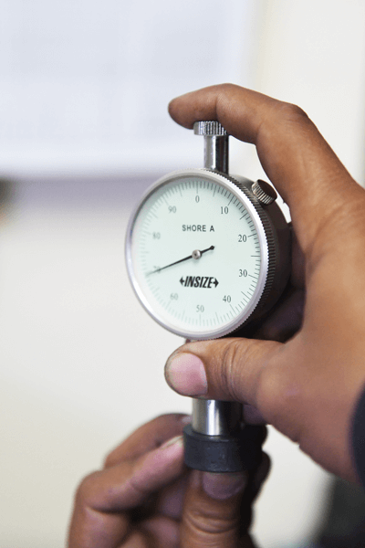 Rubber hardness is sassed using a durometer in accordance with the ASTM D2240 standard.